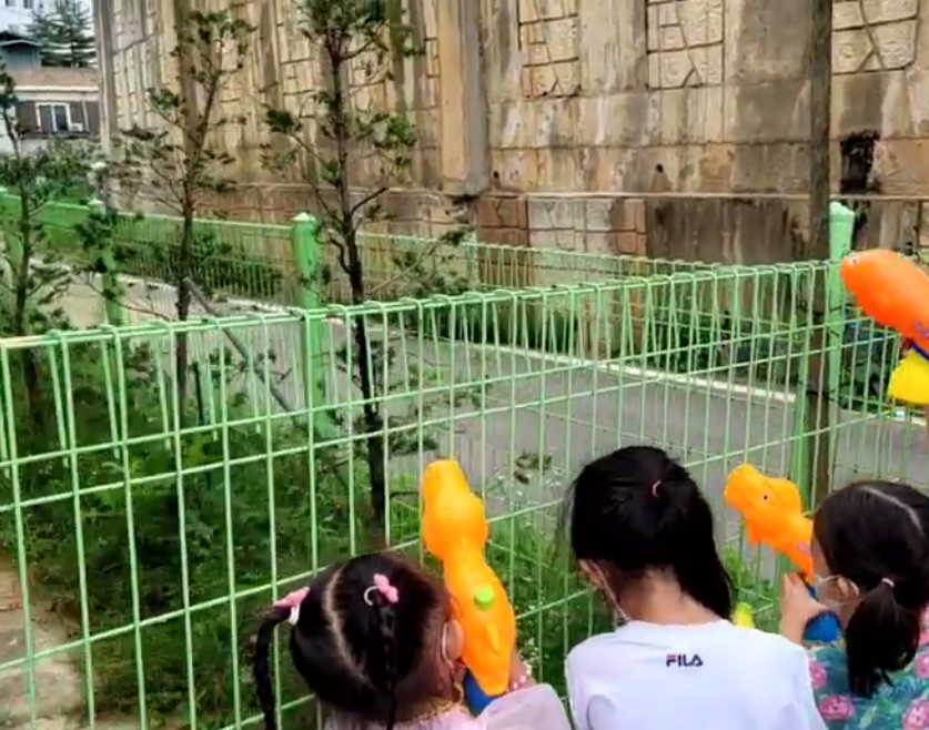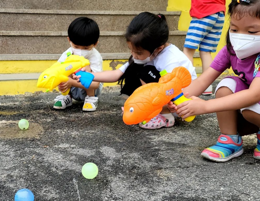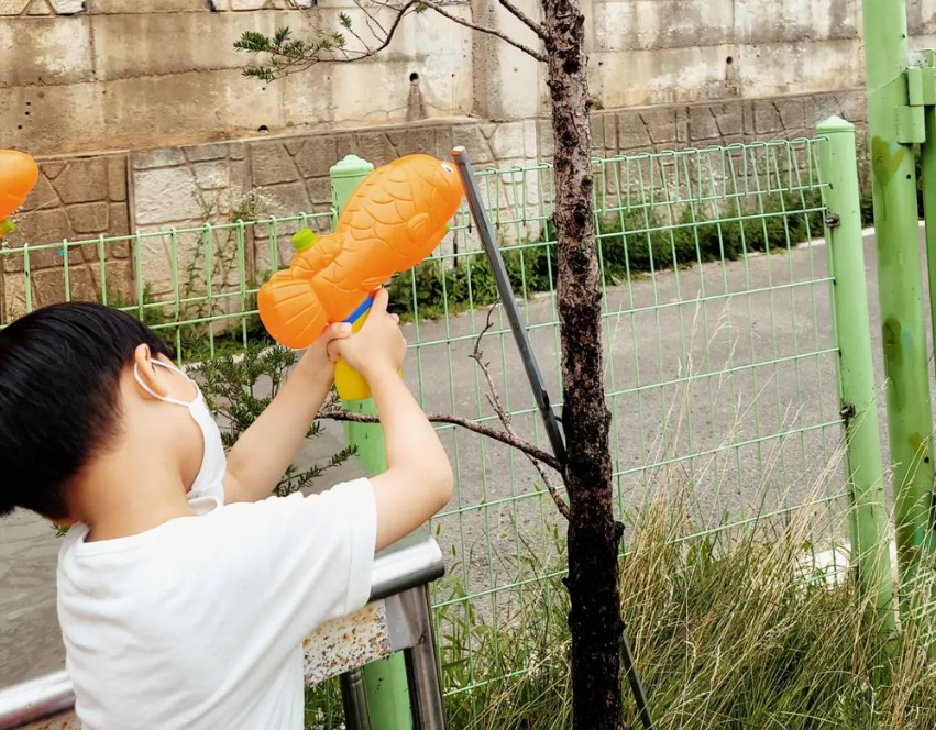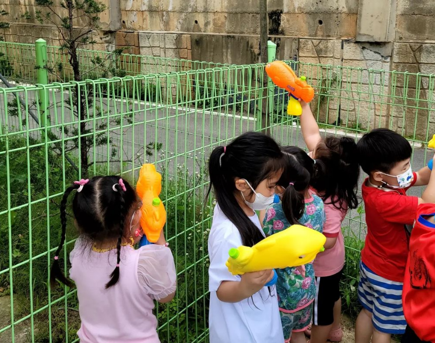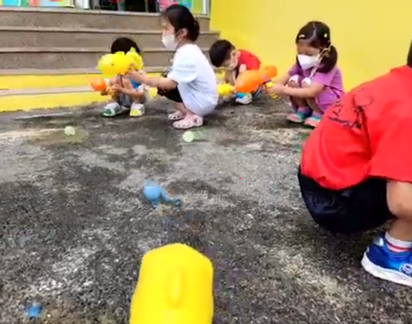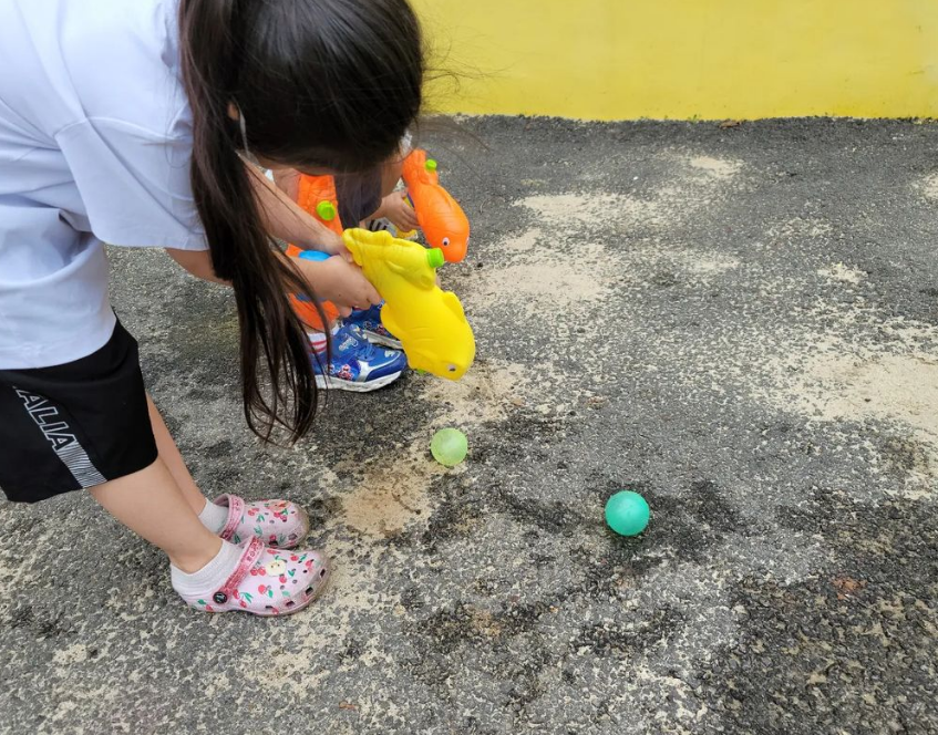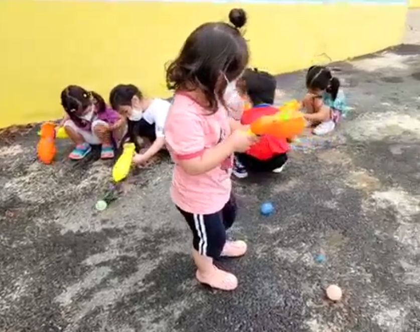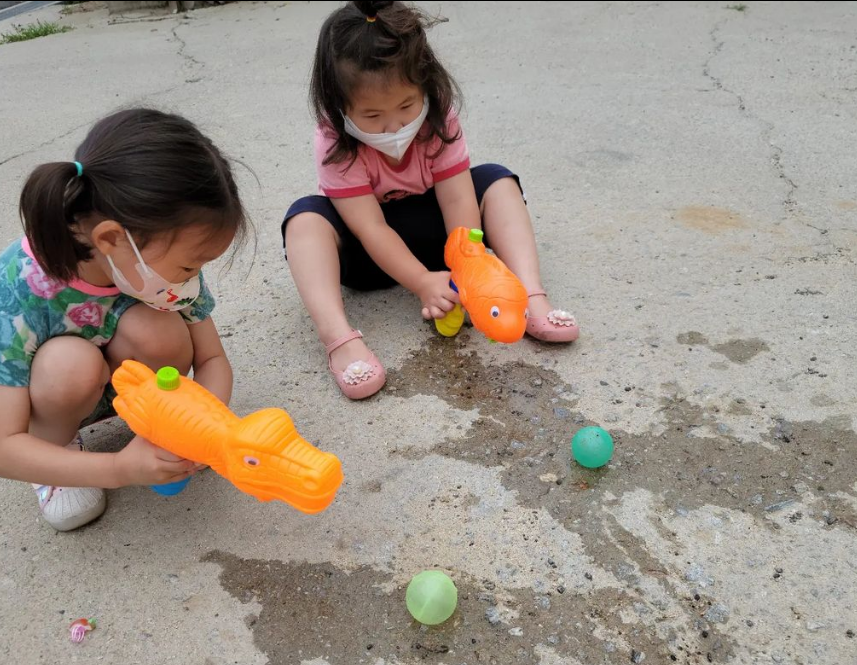 물총으로 공 굴리기하다가 어린이집 벽면 쏘기~