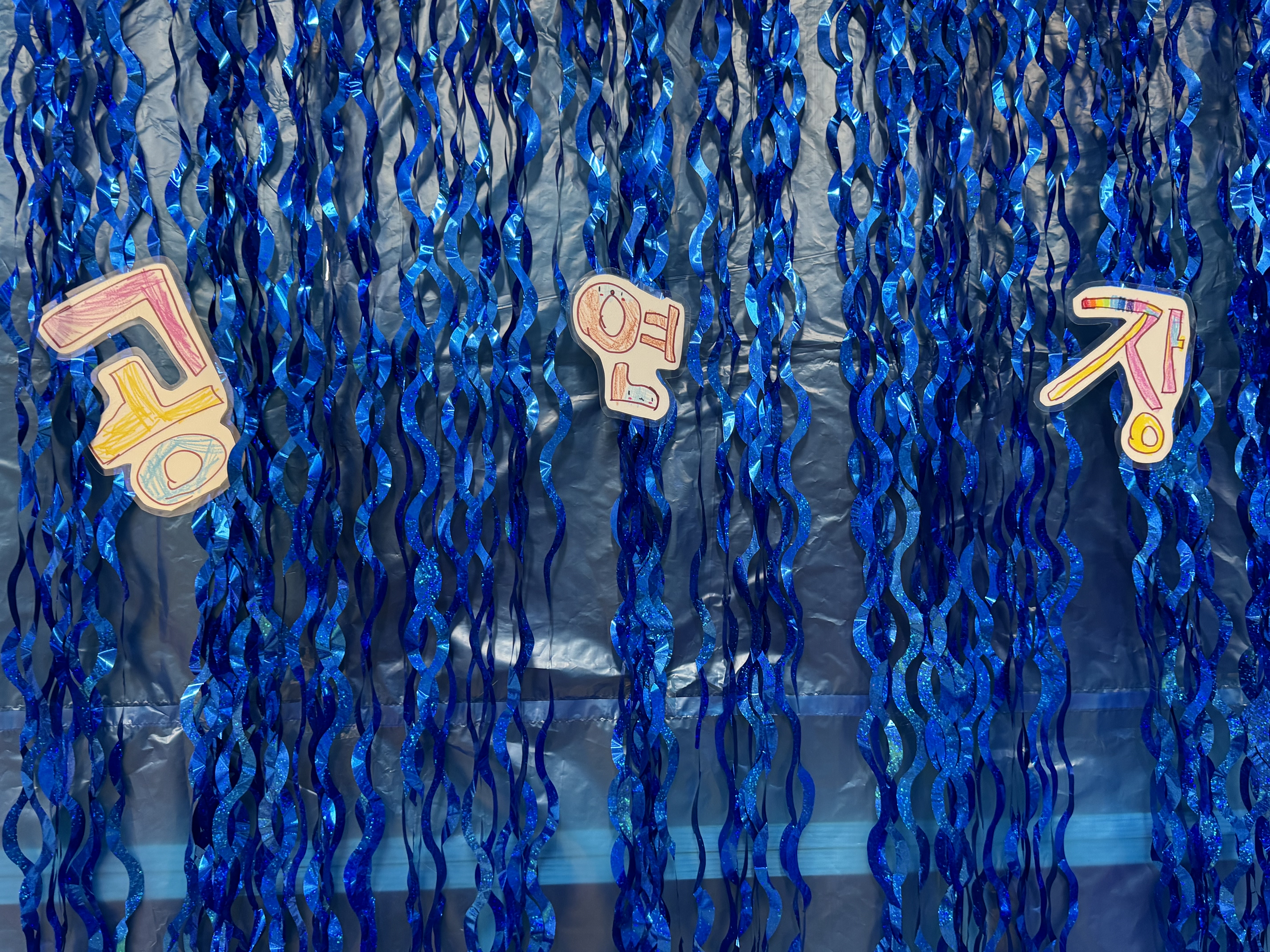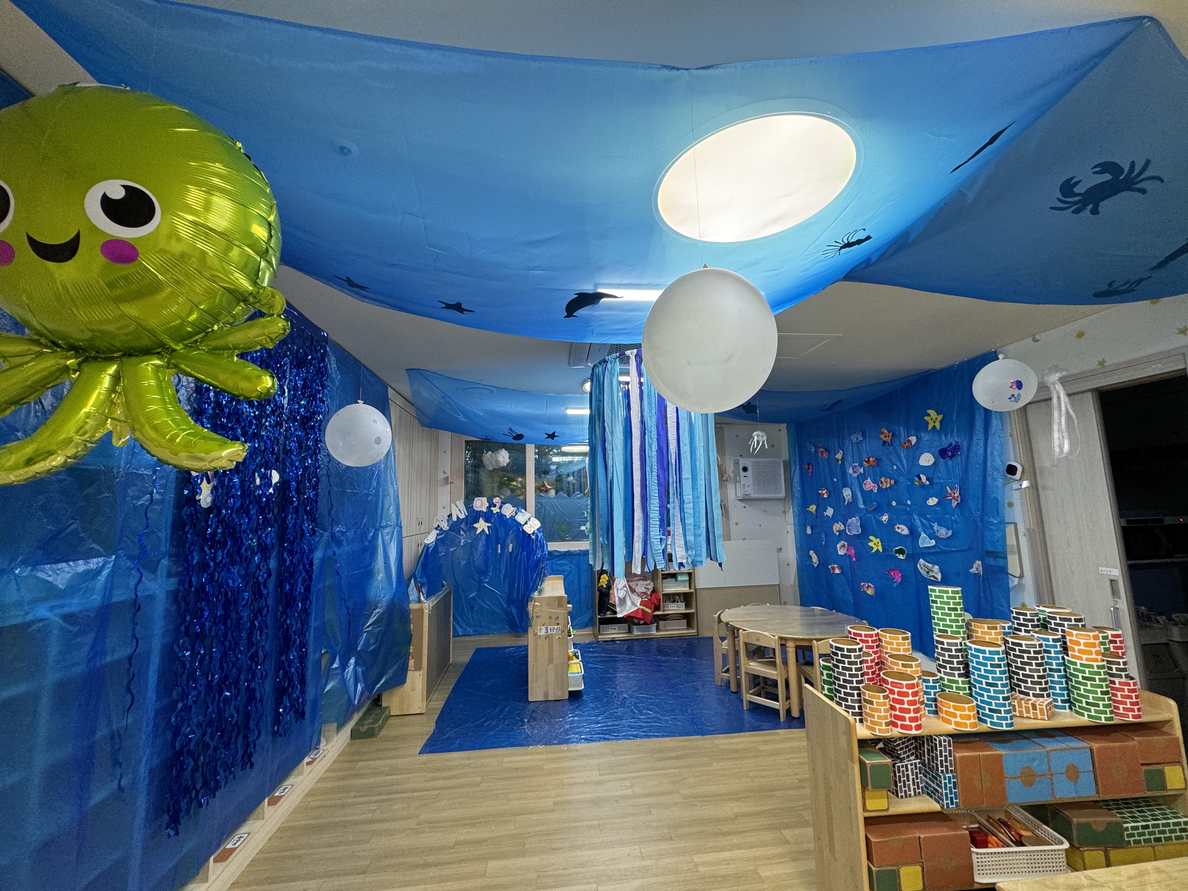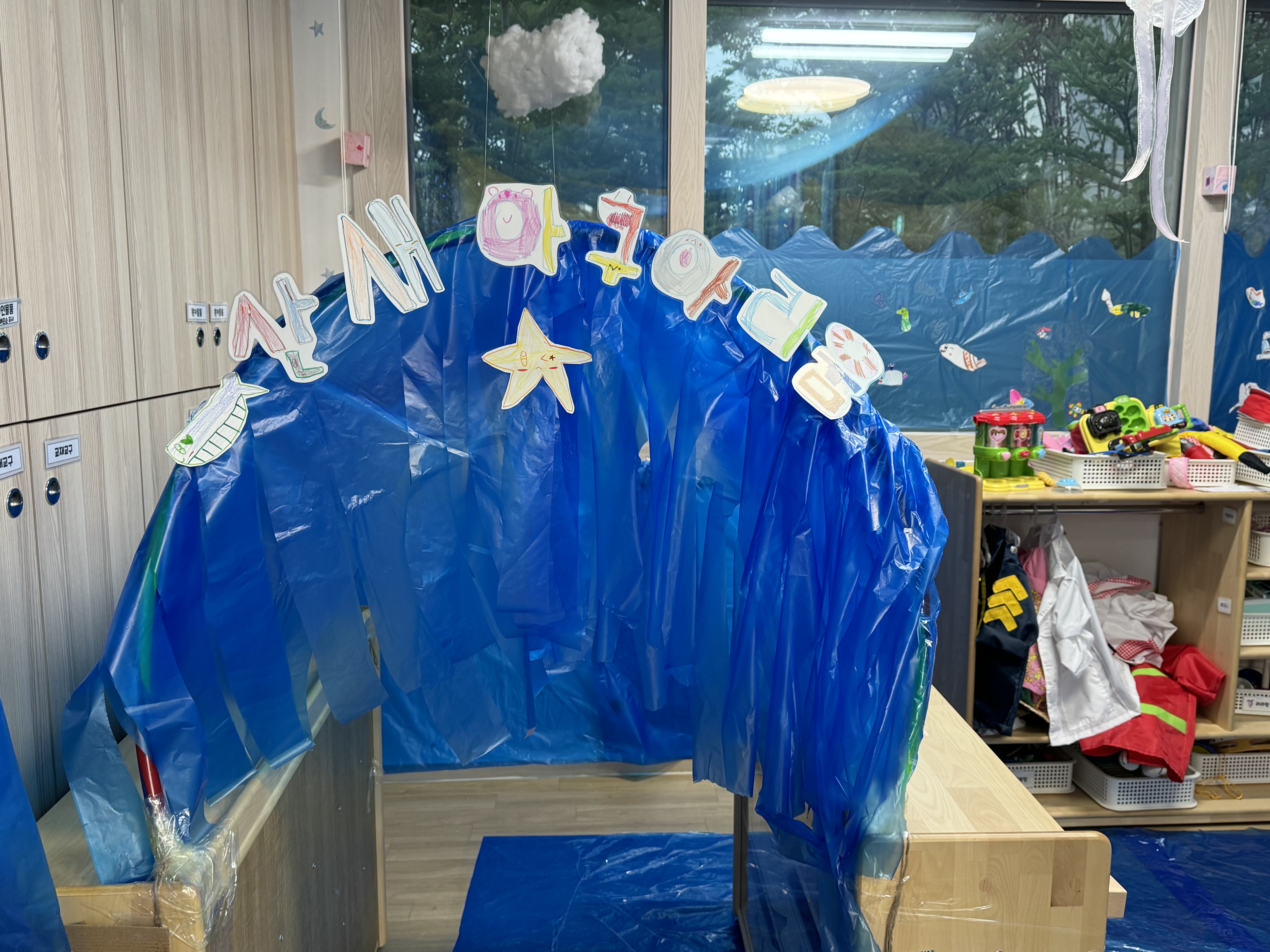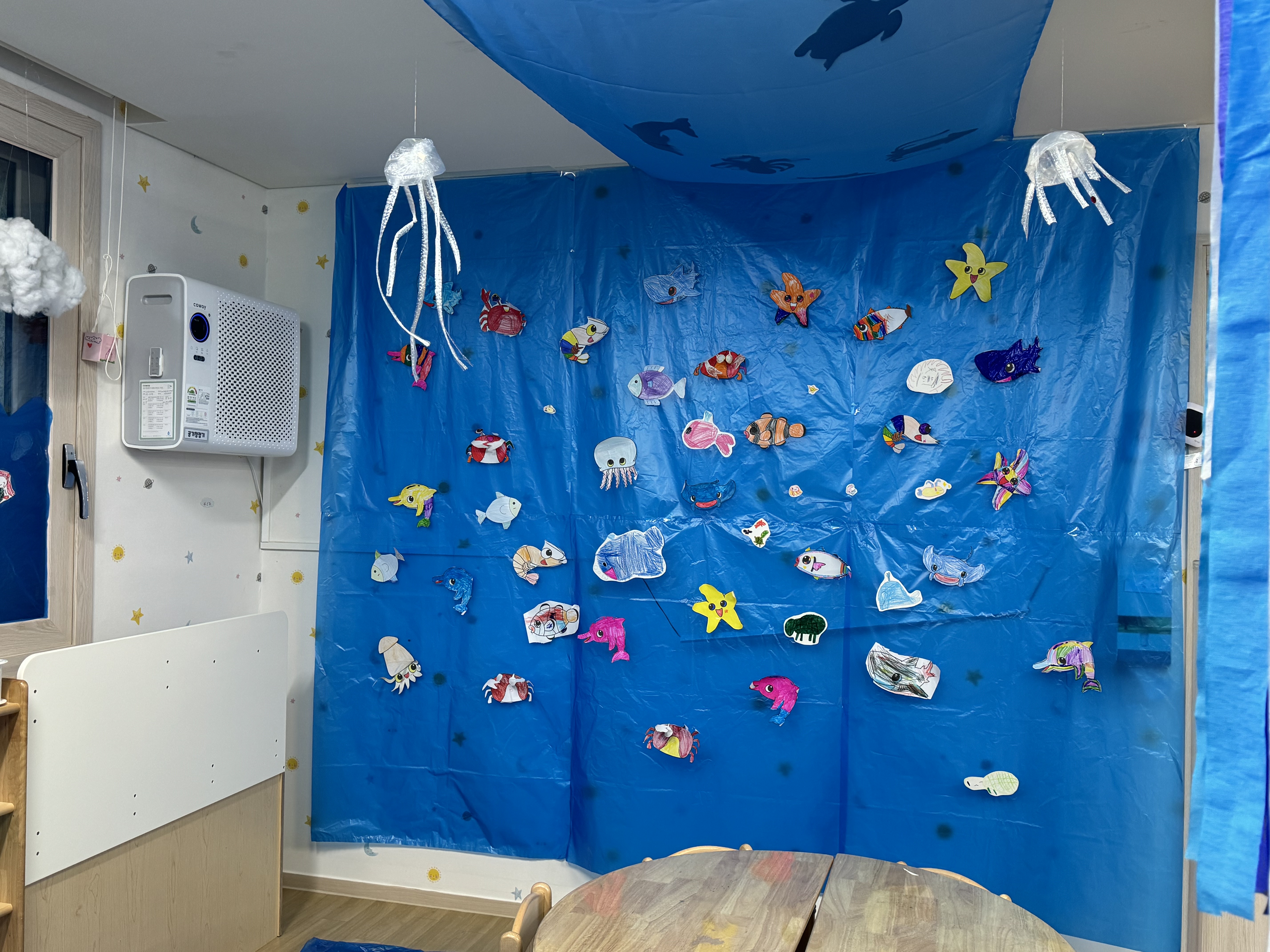 그림그리고 색칠한 바다동물들은 벽면에 붙여주었답니다!!