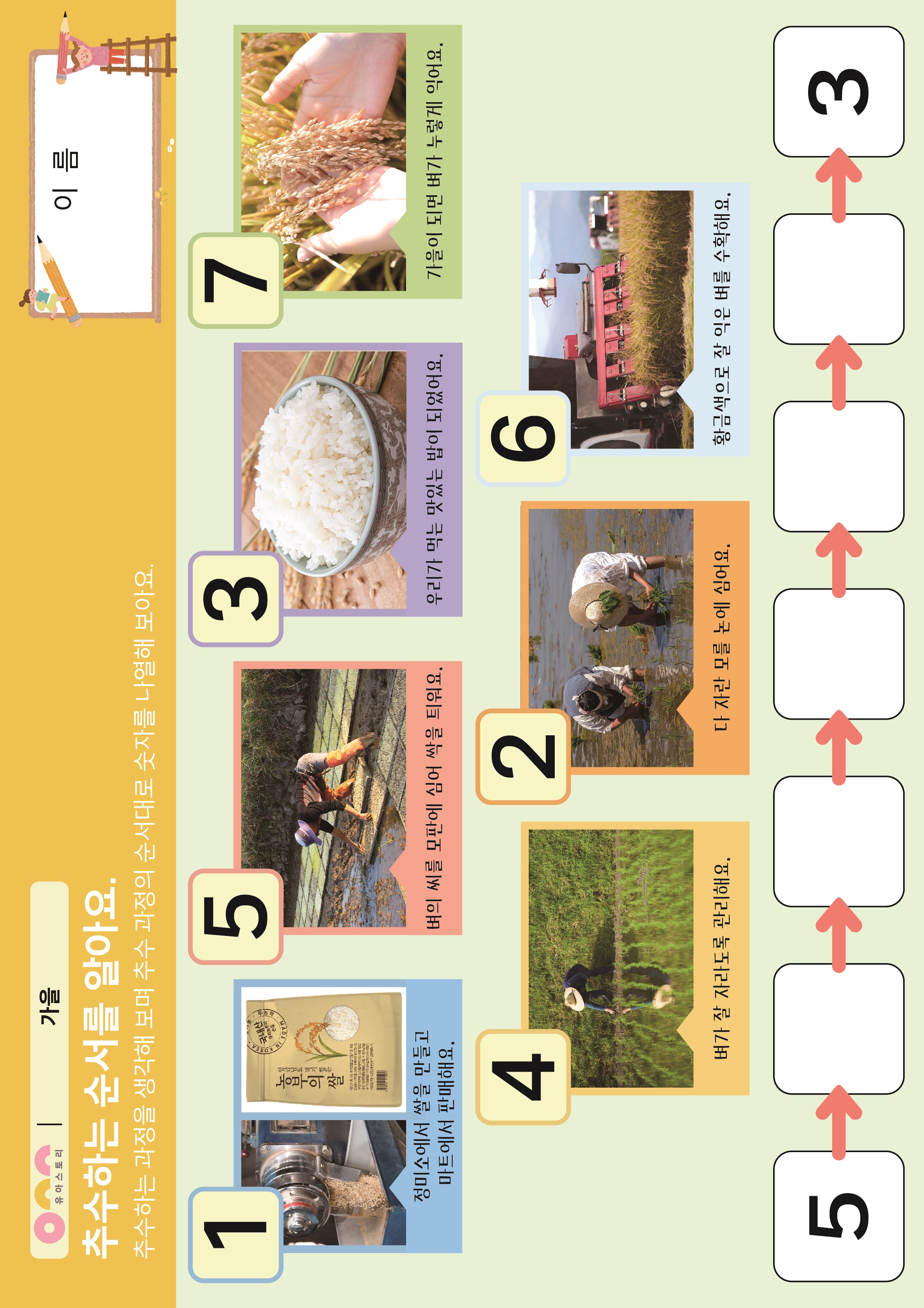 벼가 쌀이 되기까지 PPT , 활동지 여러 가지 가을 열매 PPT , 활동지 여러 가지 곡식을 이용한 음식들 도안 , PPT 논밭을 지키는 허수아비 PPT , 활동지 |