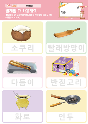 집에서 사용하는 전통 도구 PPT , 활동지 옷과 관련된 전통 도구 PPT , 활동지 개인적인 용도의 전통 도구 PPT , 활동지 농사에 사용되는 전통 도구 PPT , 활동지 |