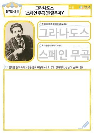 [새노래] 지구촌 어린이 도안 , 동요/음원 [음악감상] 그라나도스 ‘스페인 무곡’ 동요/음원 , 활동지 [음악감상] 퍼셀 ‘인도의 여왕’ 동요/음원 , 활동지 |