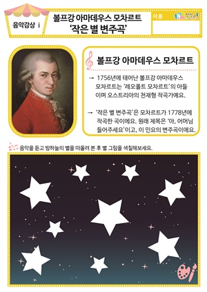 [새노래] 크고 큰 우주 작고 작은 우리 동요/음원 [음악감상] 드뷔시 ‘달빛’ 동요/음원 , 활동지 [음악감상] 모차르트 ‘작은 별 변주곡’ 동요/음원 , 활동지 |