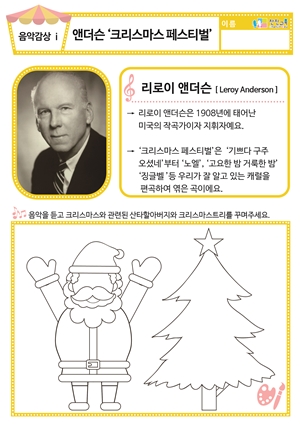 [새노래] 징글벨 동요/음원 [새노래] 아름답게 장식하세 도안 , 동요/음원 [음악감상] 앤더슨 ‘크리스마스 페스티벌’ 동요/음원 , 활동지 [새노래] 고요한 밤 거룩한 밤 만들기 , 활동지 |