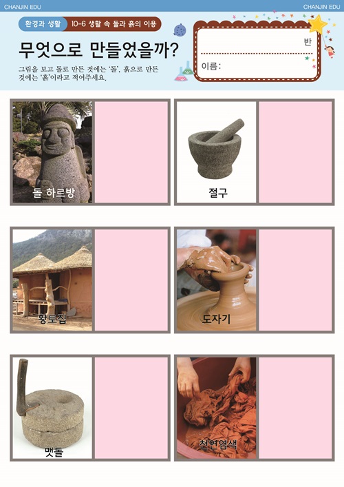 물은 어떻게 만들어질까요? 만들기 , 활동지 물의 이용 E-BOOK , PPT 돌과 흙이 필요해요. E-BOOK , PPT , 활동지 생활 속 돌과 흙의 이용 PPT , 활동지 흙의 고마움 PPT , 활동지 |