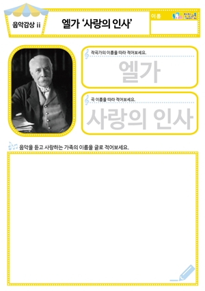 [새노래] 예쁜 손 동요/음원 [음악감상] 엘가 ‘사랑의 인사’ 도안 , 동요/음원 , 활동지 [음악감상] 마르티니 ‘사랑의 기쁨’ 동요/음원 , 활동지 |