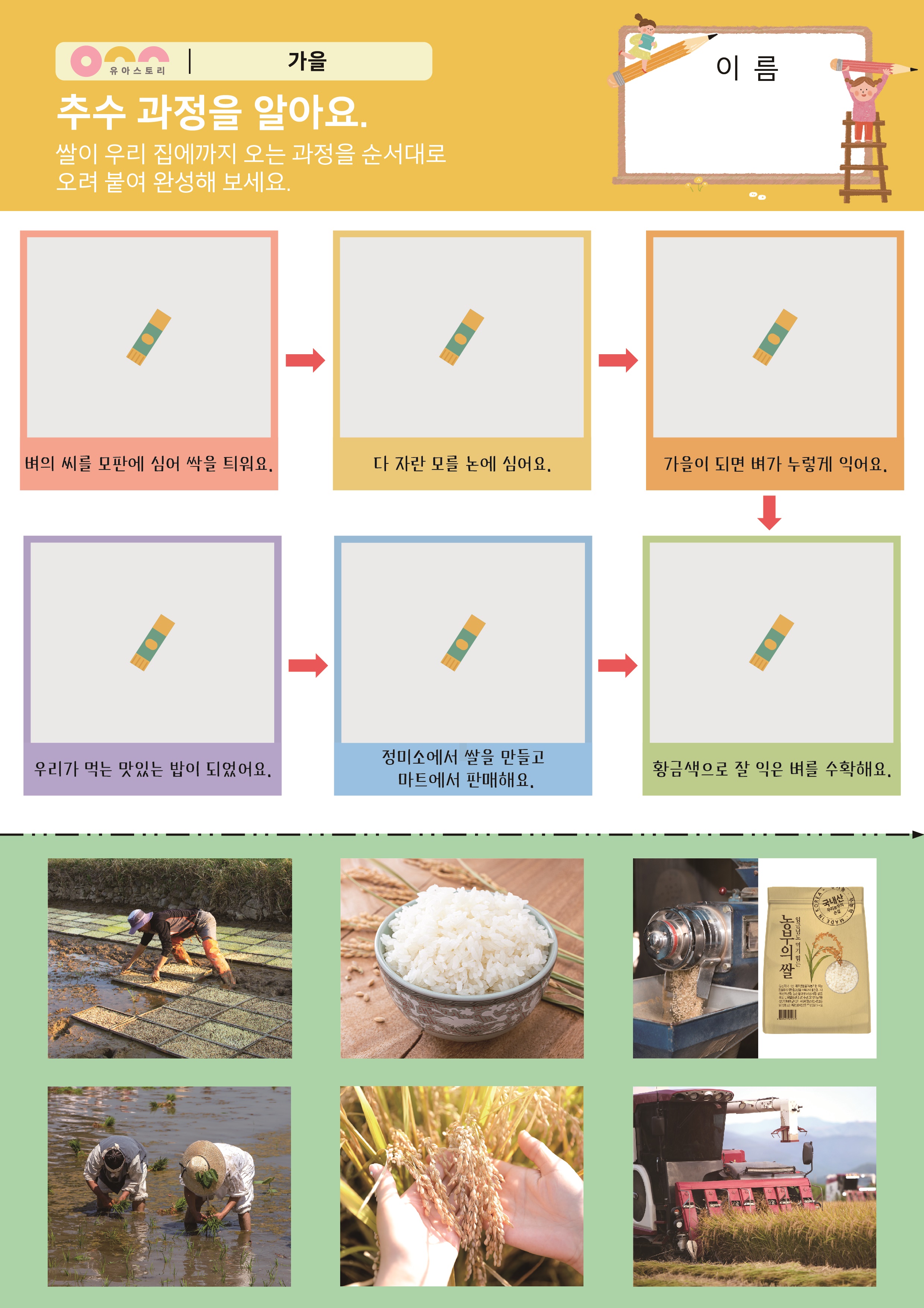 추수를 해요. PPT , 활동지 가을에 볼 수 있는 열매 PPT , 활동지 쌀을 수확해요. E-BOOK , PPT , 활동지 여러 가지 곡식을 이용한 음식들 도안 , PPT |