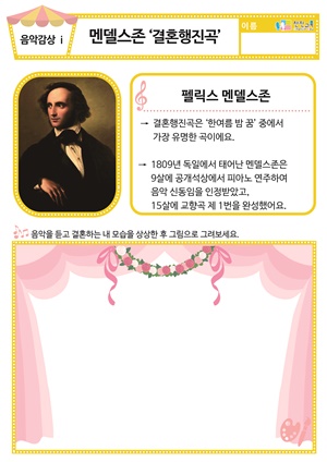 [새노래] 당신은 사랑받기 위해 동요/음원 , 도안 [음악감상] 멘델스존 ‘결혼행진곡’ 동요/음원 , 활동지 [음악감상] 모차르트 ‘피가로의 결혼’ 동요/음원 , 활동지 |