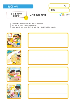 행복한 결혼식 도안 , PPT , 활동지 나는 이렇게 태어나고 자랐어요. 동영상 , PPT 다양한 가족유형이 있어요. E-BOOK , PPT , 활동지 피부색이 다른 친구를 만났어요. E-BOOK , PPT |
