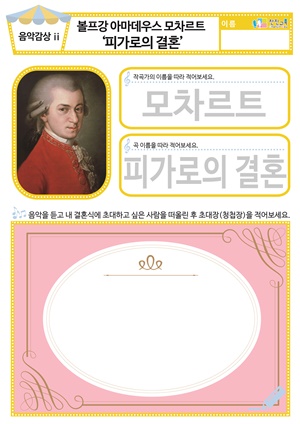 [새노래] 당신은 사랑받기 위해 동요/음원 , 도안 [음악감상] 멘델스존 ‘결혼행진곡’ 동요/음원 , 활동지 [음악감상] 모차르트 ‘피가로의 결혼’ 동요/음원 , 활동지 |