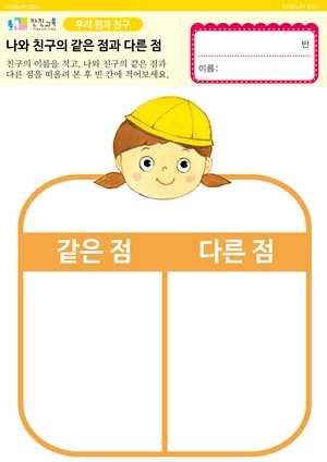 친구에게 나를 소개해보고 친구와 즐겁게 지내기 위해 지켜야 할 약속을 정해본다. |