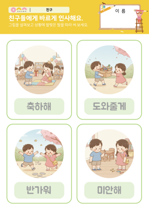 나와 친구의 같은 점과 다른 점을 찾아요. 도안 , 활동지 서로 칭찬해요. PPT , 활동지 양보와 배려가 필요한 상황이 있어요. E-BOOK , PPT , 활동지 |