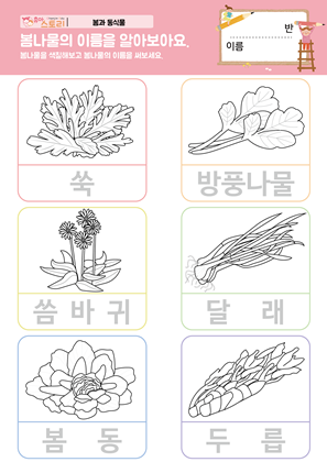 봄나물 봄동산 활동지 봄나물 책갈피 만들기 봄나물 프로타주 활동지 봄나물로 얼굴 꾸미기 활동지 |