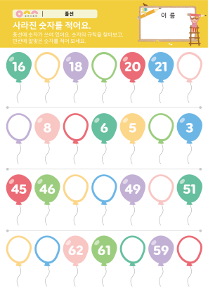 요술 풍선 패턴 놀이 만들기 , 사진 사라진 숫자를 적어요. 사진 , 활동지 |